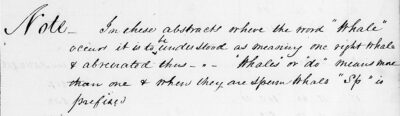 Caution: In the process of creating an Index to the online Maury Abstracts available from the U.S. National Archives a ‘Note’ was found at the front of volume 65 which reveals that half-way through the process of creating the original abstracts a decision was made to abbreviate ‘right whale’ to ‘whale’.
