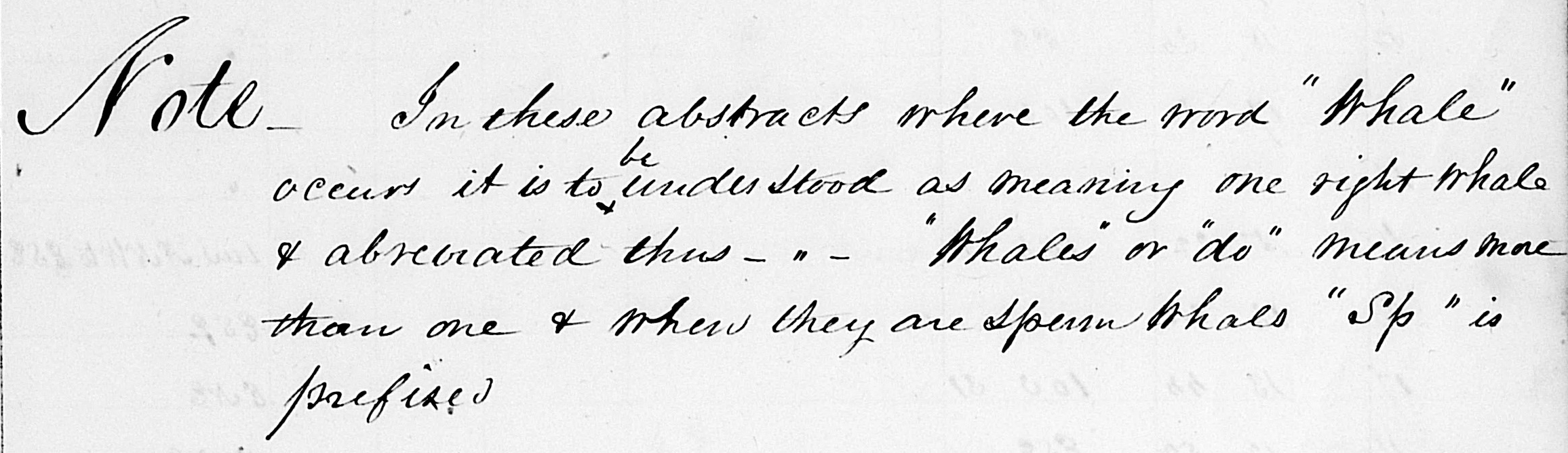 Note… In these abstracts where the word “Whale” occurs it is to be understood as meaning one right whale & abreviated [sic] thus —″— “Whales” or “do” means more than one & when they are sperm whals [sic] “Sp” is prefixed.